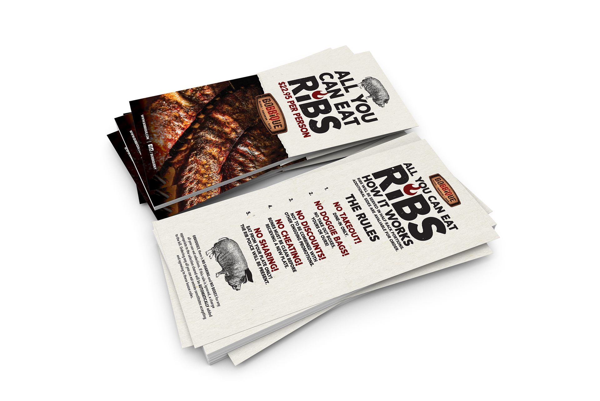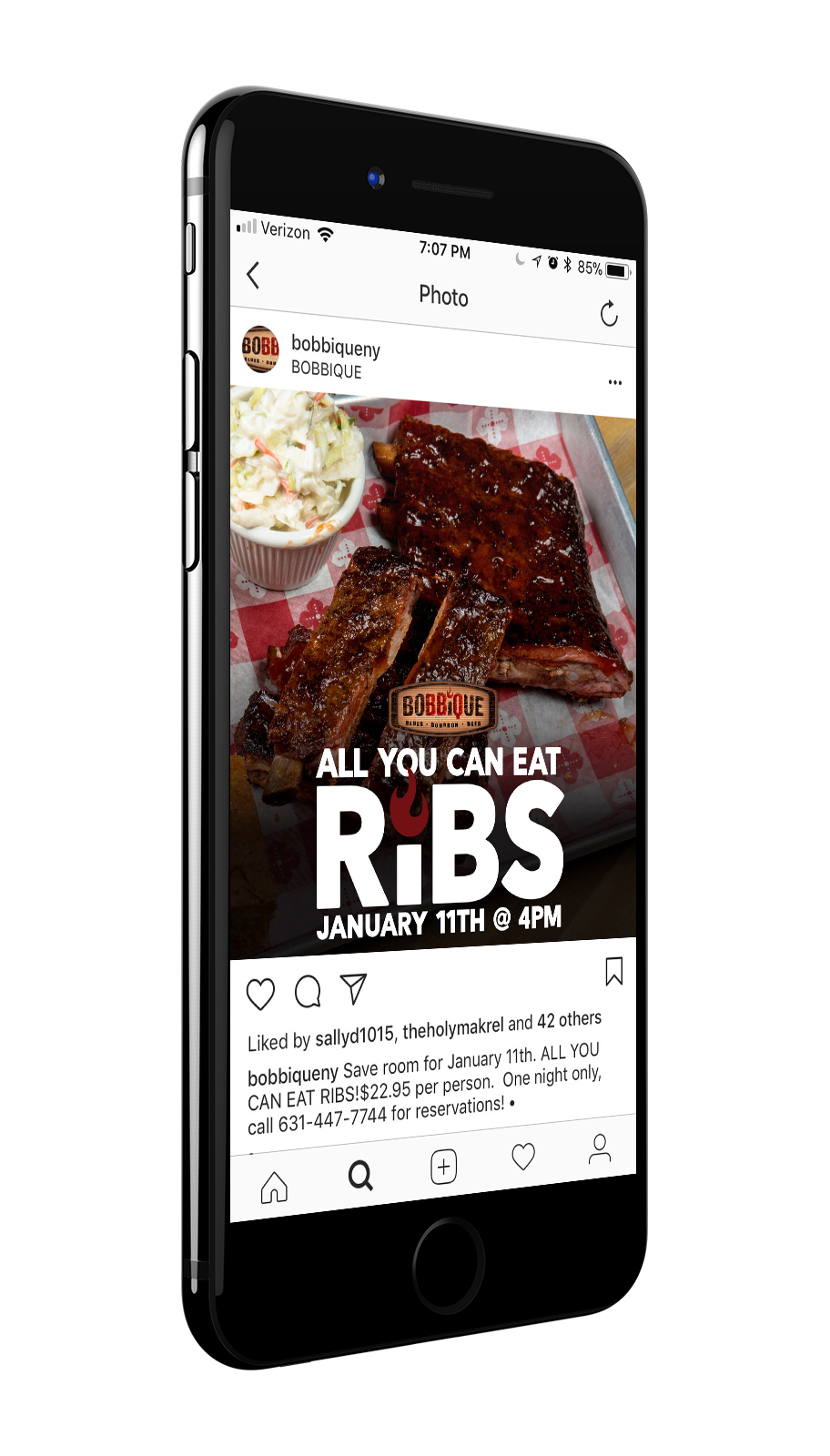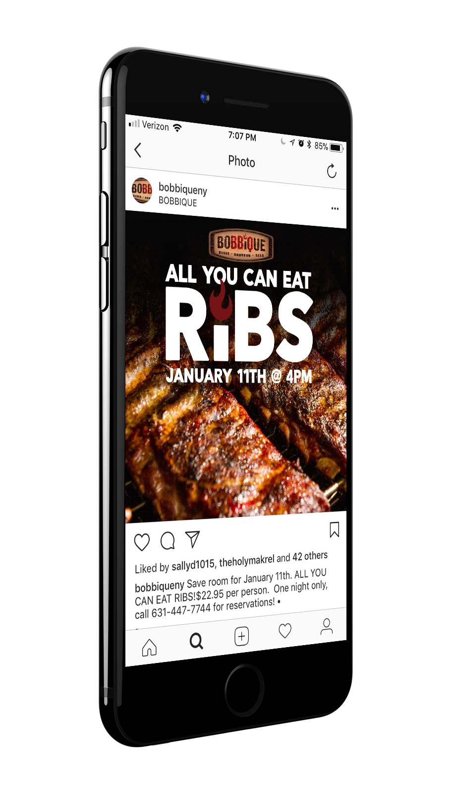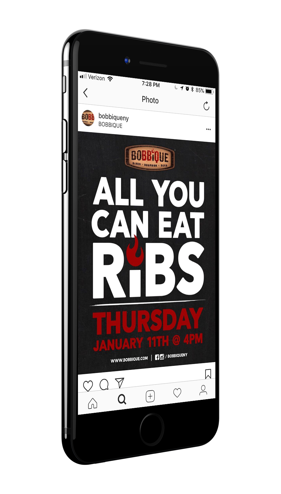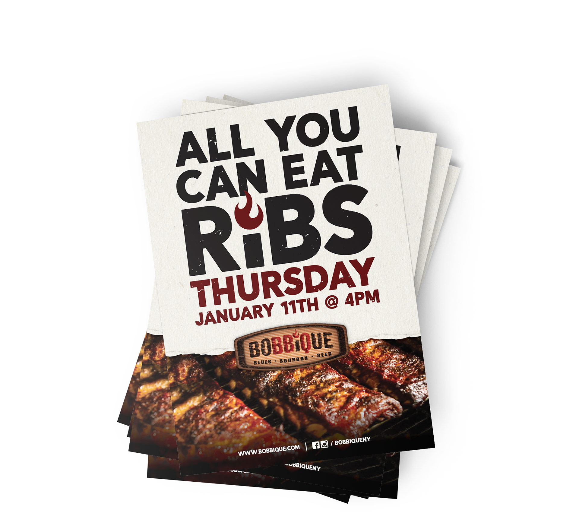 Organic social media campaign for All You Can Eat Ribs night at Bobbique in Patchogue, NY. Designs include print flyers, posters, menus and digital graphics for social media such as Instagram & Facebook.