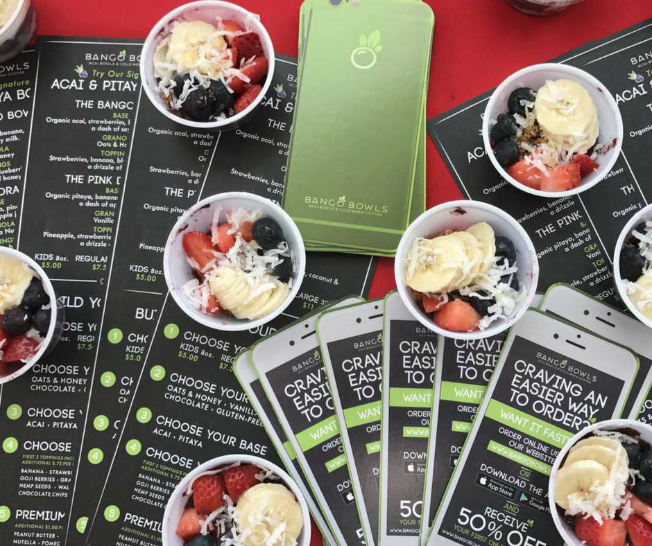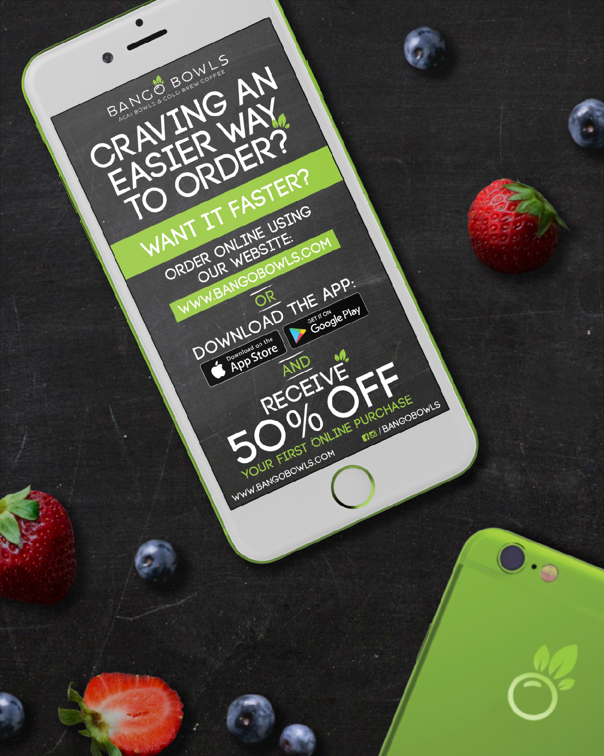 Print design created for Bango Bowls, a local franchise who specialize in serving acai bowls & more. Includes a custom dye cut design of a green iPhone, take-out menu & wall menu designs.