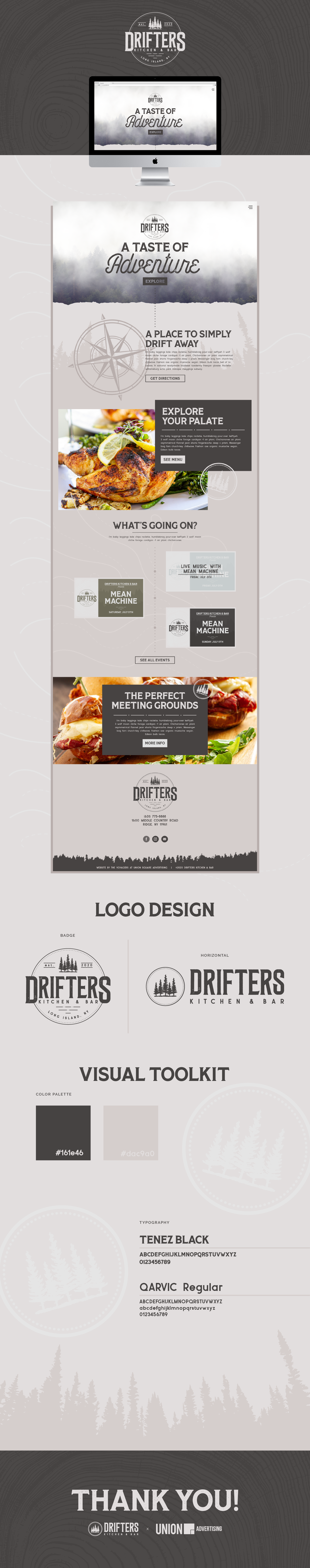 Restaurant branding for Drifters Kitchen & Bar, a business located in Ridge, NY. Branding included an original logo concept and a fully functional website design. See more at drifterskitchenandbar.com