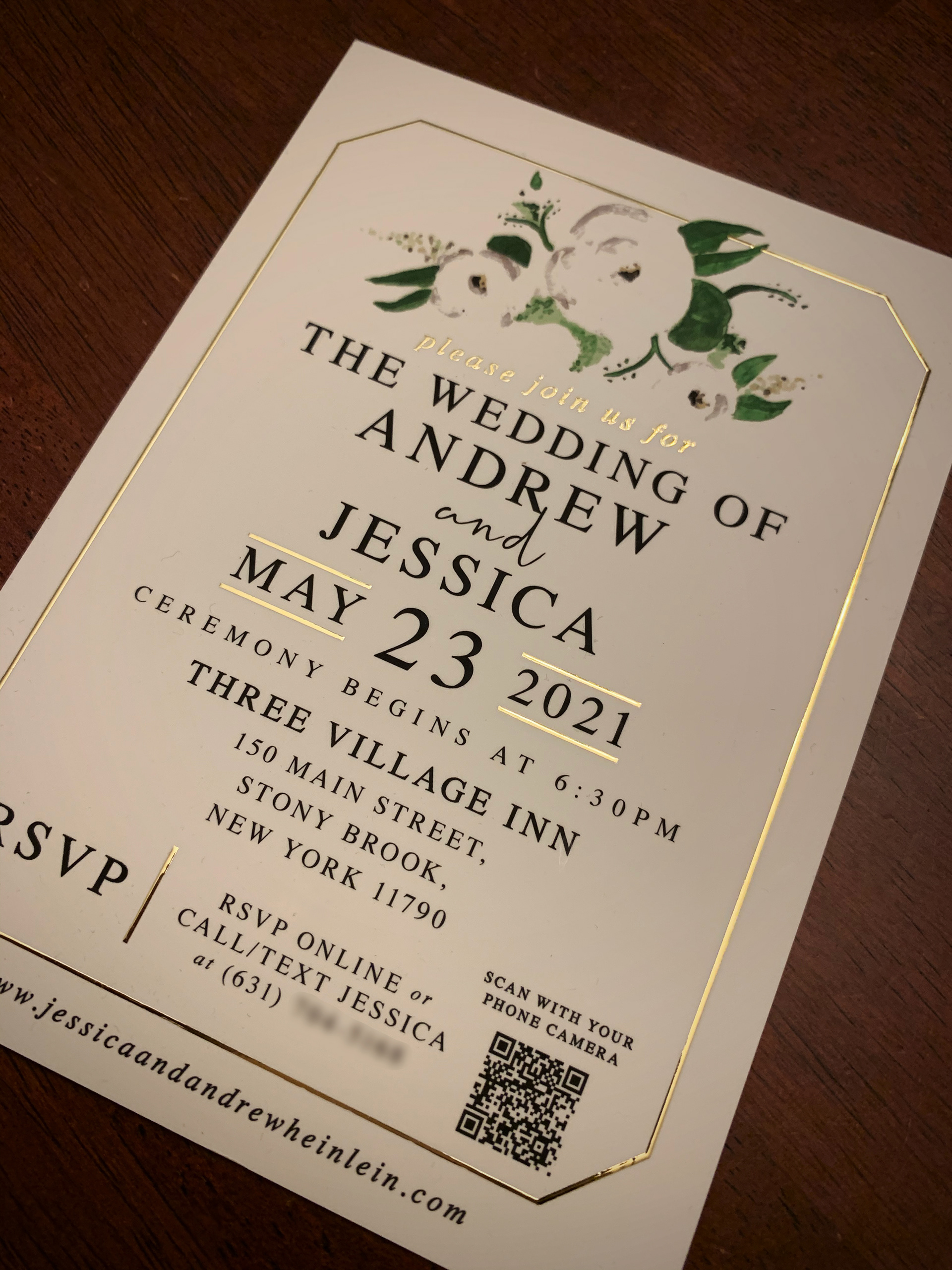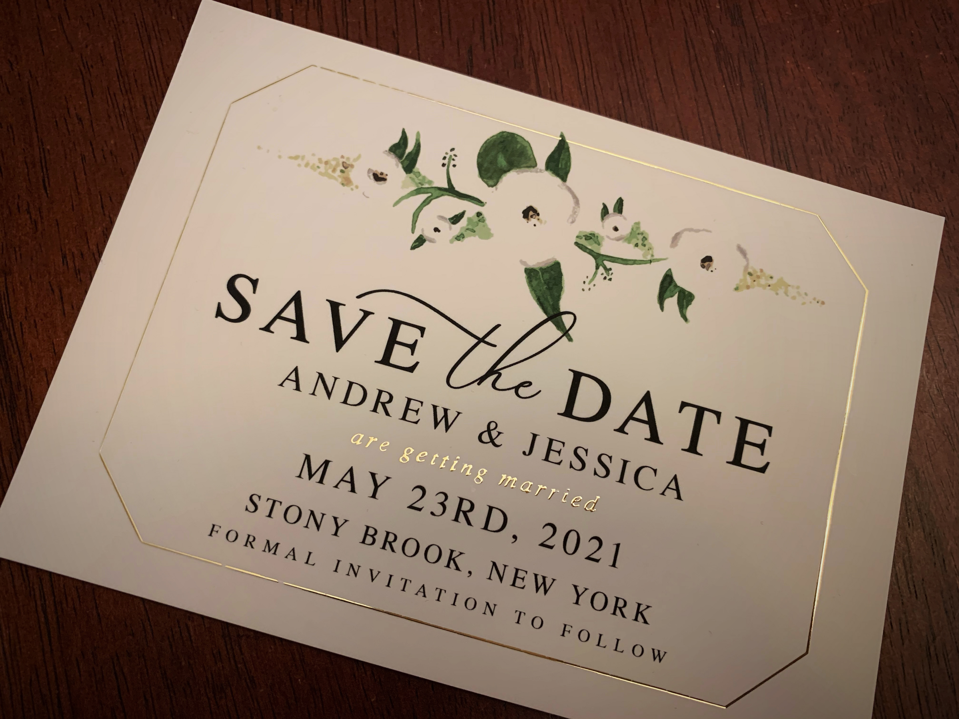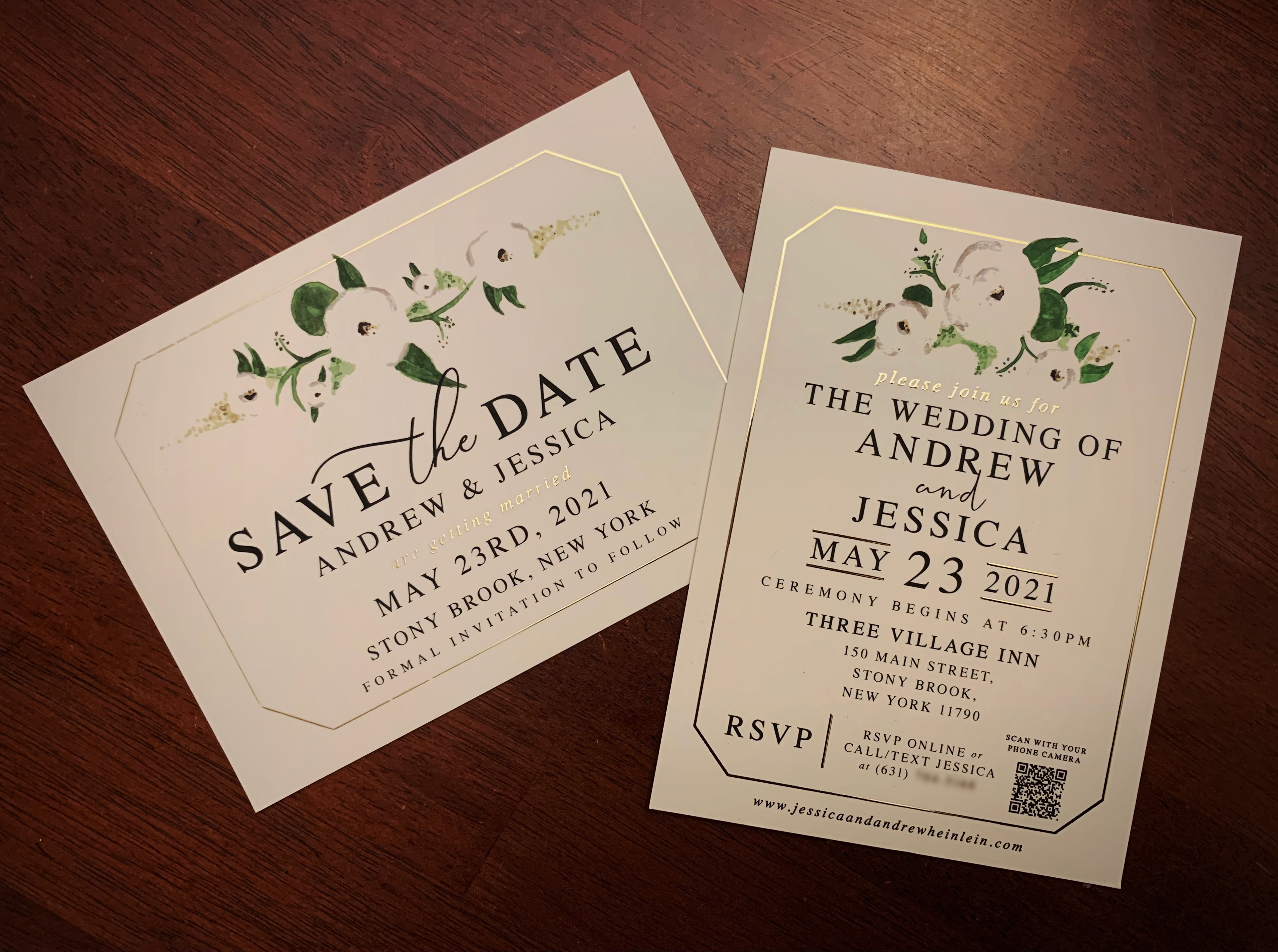 Custom wedding invitations & save the dates. Watercolor painted white roses and typography added in Adobe Illustrator.